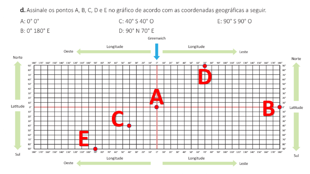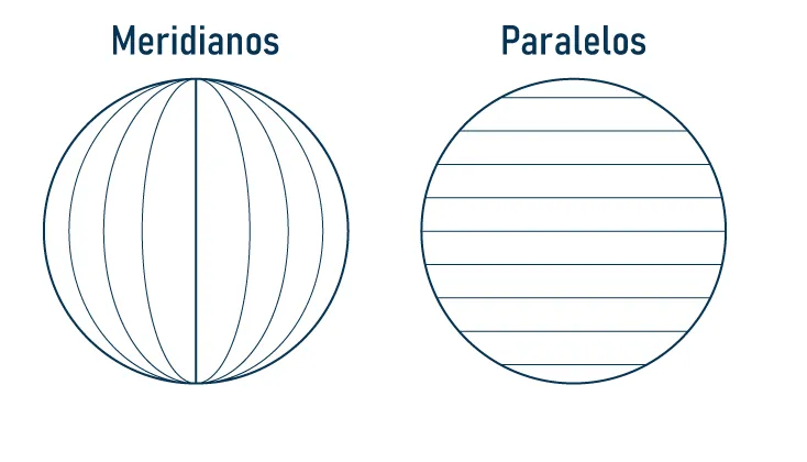 • Meridianos (Longitude): São as linhas em pé. O principal é o Meridiano de Greenwich, que divide a Terra em Hemisfério Oriental (Leste) e Ocidental (Oeste).