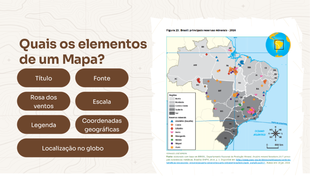 Para ler um mapa, você precisa conhecer as “peças” que o formam. Todo mapa oficial tem 5 elementos obrigatórios: